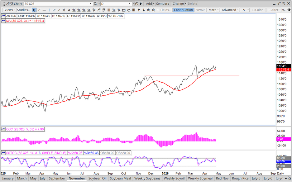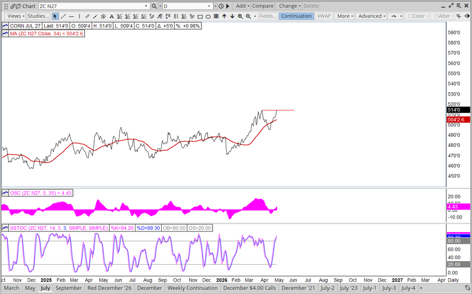 All ended higher with corn and wheat the big percentile winners. Beans perked up considerably and closed less than $.03 from the mid-March closing high. Chicago wheat lead the day with a new high close from contract low. KC wheat staggered for a while Chicago, but straightened up towards the close. I anticipate all three to continue higher.