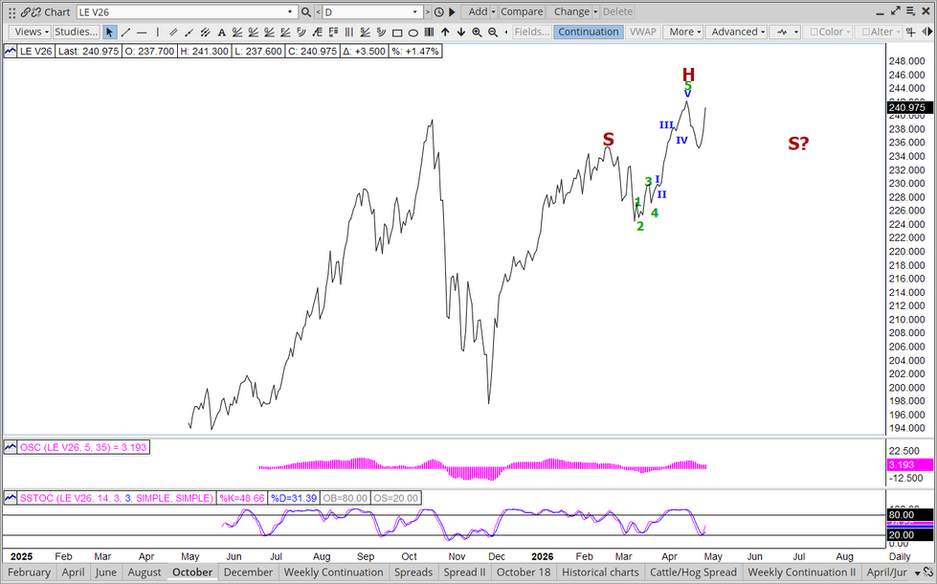 Futures traders continued to narrow basis spreads starting off the week. Although not the best marketing price structure, it is improved greatly from last week, and second only to two weeks ago. Contract high may or may not be a hurdle. For the moment, there is no one that I have spoken with that does not anticipate a new high. Hence, self fulfilling prophecies' would not be out of the ordinary. A new contract high will void the Head & Shoulders pattern and force another review of the wave count. Regardless of top or not, the extensive rationing, through a higher price, is not being met with what would normally be a contraction of production capacity. No one seemingly wants to give up, or has to give up at the moment. We've seen signs and signals, but little actual reduction of production capacity. So, whether prices move higher or lower, what appears to be taking place is, producers are assuming greater financial output, with less inventory to work with, creating a narrower margin of error and widening the projected negative profit margin into the future. Nothing has changed in that prices have to go up, and a lot, to return input costs. What has changed is the pricing structure you market into has improved greatly from last week. Outside of the feeder cattle input costs continue to rise as well. Corn continues to inch up and diesel fuel in leaps and bounds, suggesting how badly cattle feeders need the higher price.