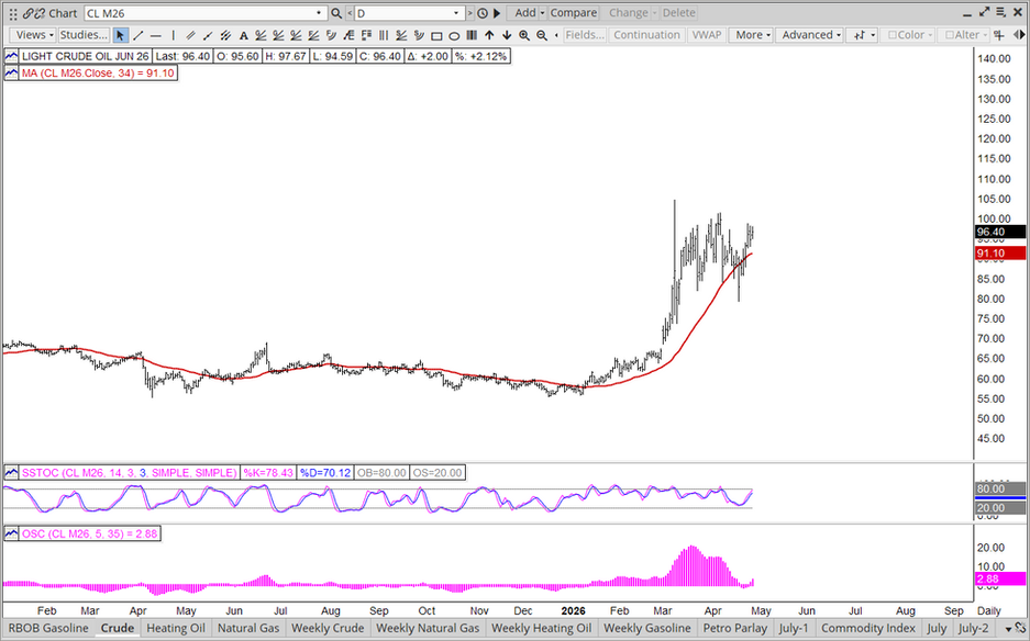 Energy was sharply higher on the day. I anticipate energy to continue higher. Huge daily price swings continues to be present in the energy market with computers scanning every headline for key words to send buy or sell orders into the market. It is truly amazing watching how quickly a price can move when the computers become active. Nonetheless, diesel fuel remains impacted by the current military operations in the middle-east, the planting of 180 million acres of corn and soybeans, and the normal transportation and distribution of goods in a changing season. Although we have ample oil and oil reserves, there is a finite amount of refining capabilities and little way to increase, anytime soon. This leads to shortages for the products and potential glut of oil. I continue to anticipate significant volatility and price expanse.