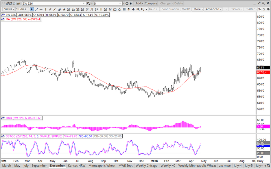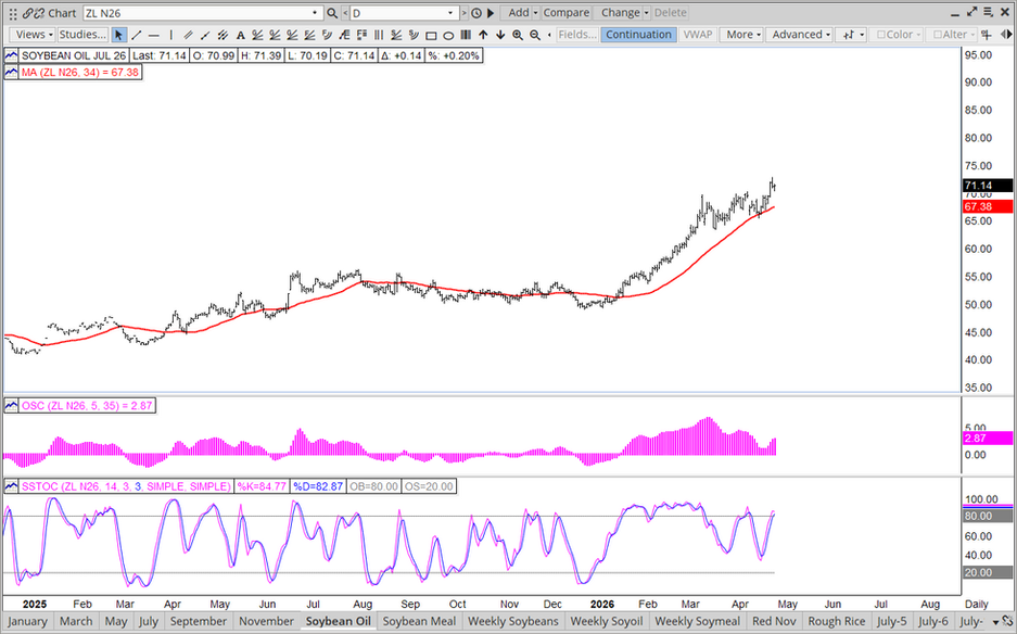 Kansas City wheat blew the top out today with new contract highs. Chicago wheat tagged behind, but made definitive headway as well. Wheat is anticipated to move higher with KC currently the leader. With the breakout to the upside, a wave 3 target measures to $7.70 December KC. Even though July is the new crop contract, it won't matter as much how short the crop is, as at harvest, it will the most abundant of any other time frame. Therefore, go out to the December or March/May of '27, where a short crop this year will produce a lower carryout into next year. Corn was able to push higher as well. Beans sat in the time out seat for the whole day as maybe traders were using beans to spread wheat and corn against. Nonetheless, I anticipate all to continue higher.