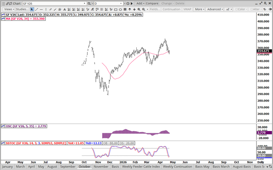 No shortage of volatility here either. I anticipate a sharply lower trade into the first couple of days of May with expectations of a test of the March low per respective contract month. At the first of May, the seasonal tendency picks up and reflects an upward bias until mid July. I anticipate this part of the seasonal tendency to unfold, but I don't anticipate new contract highs, with expectations of a sloppy, sideways to higher trade to mark time into July. By then, we will know what the Semi-Annual cattle inventory report shows, and whether drought has impacted the summer grazing. While there may not be any more cattle to work with, it appears there will be no less either. A stagnant market at this time would be horrible as it would have most of the negative projected margins come to fruition, and not producing a low enough trade to find margin for the next round of production. I know how difficult marketing decisions can be. Especially with the clarity of hindsight. It is foresight that is sought now and however foggy it may be, the risk of running off a cliff in the fog is as good as climbing a hill in the fog.