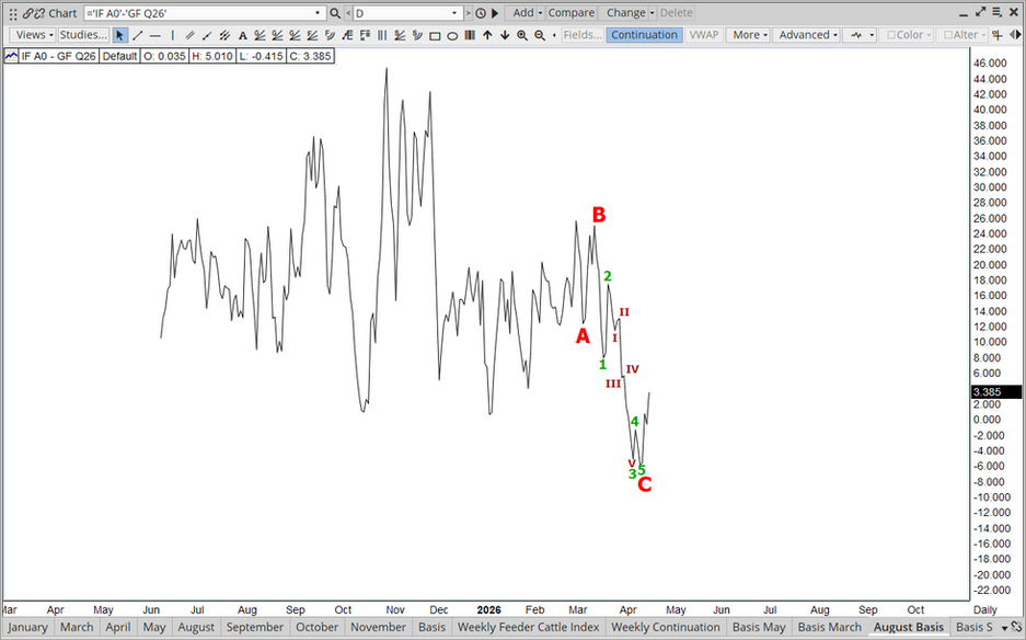In my opinion, the cattle market is believed moving into equilibrium. Rationing has caused significant shifts in domestic production and processing. Enough so that it is believed going to be difficult to continue shifting without the loss of some production or processing capacity. The closing of the Mexican border is reshaping US beef imports. The closure has increased production and processing capabilities for which Mexico is now circumventing the border closure towards cattle, by simply shipping the beef across. All the while, the Mexican cow herd is believed to have expanded as there isn't a lot for the bulls, cows, and heifers to do while waiting to either cross the border, or place into beef production. China is believed circumventing US beef through Canada. High prices tend to increase competition, with Canada and Mexico now believed benefiting greatly from the US cattle and beef markets. There seems to be a lull in domestic beef demand for the moment that is causing some of the equilibrium. The inability to push beef prices higher, while manipulating the slaughter lower, isn't a good sign for beef movement. If we see more evidence of equilibrium, or simply stagnation in prices, a great deal of the projected negative margins may come to fruition, even if prices don't move lower. Cattlemen stretched themselves a little further starting the week off, but as the projected negative margins grew worse, futures traders decided to let the cattlemen assume their own risk by swapping basis from negative to positive by over $22.00 in two trading days. The combination of higher index reading, caused by cattlemen, and lower futures, caused by traders, helped to exaggerate the basis swing. Observation of, the earlier in the week price structure of the board, led to multiple recommendations to achieve a minimum sale floor at or near historical high. Most strategies would have allowed for several dollars higher were that to have been achieved. Thursday and Friday's significant trade lower of futures spread basis sharply positive now, pushing the balance of risk back to the producer.