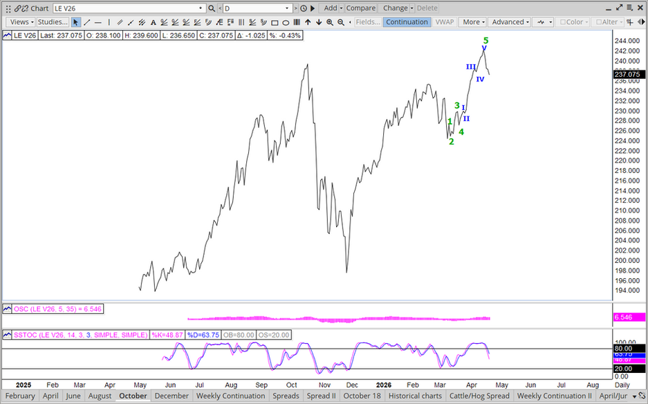 In my opinion, the cattle market is believed moving into equilibrium. Rationing has caused significant shifts in domestic production and processing. Enough so that it is believed going to be difficult to continue shifting without the loss of some production or processing capacity. The closing of the Mexican border is reshaping US beef imports. The closure has increased production and processing capabilities for which Mexico is now circumventing the border closure towards cattle, by simply shipping the beef across. All the while, the Mexican cow herd is believed to have expanded as there isn't a lot for the bulls, cows, and heifers to do while waiting to either cross the border, or place into beef production. China is believed circumventing US beef through Canada. High prices tend to increase competition, with Canada and Mexico now believed benefiting greatly from the US cattle and beef markets. There seems to be a lull in domestic beef demand for the moment that is causing some of the equilibrium. The inability to push beef prices higher, while manipulating the slaughter lower, isn't a good sign for beef movement. If we see more evidence of equilibrium, or simply stagnation in prices, a great deal of the projected negative margins may come to fruition, even if prices don't move lower. Cattlemen stretched themselves a little further starting the week off, but as the projected negative margins grew worse, futures traders decided to let the cattlemen assume their own risk by swapping basis from negative to positive by over $22.00 in two trading days. The combination of higher index reading, caused by cattlemen, and lower futures, caused by traders, helped to exaggerate the basis swing. Observation of, the earlier in the week price structure of the board, led to multiple recommendations to achieve a minimum sale floor at or near historical high. Most strategies would have allowed for several dollars higher were that to have been achieved. Thursday and Friday's significant trade lower of futures spread basis sharply positive now, pushing the balance of risk back to the producer.